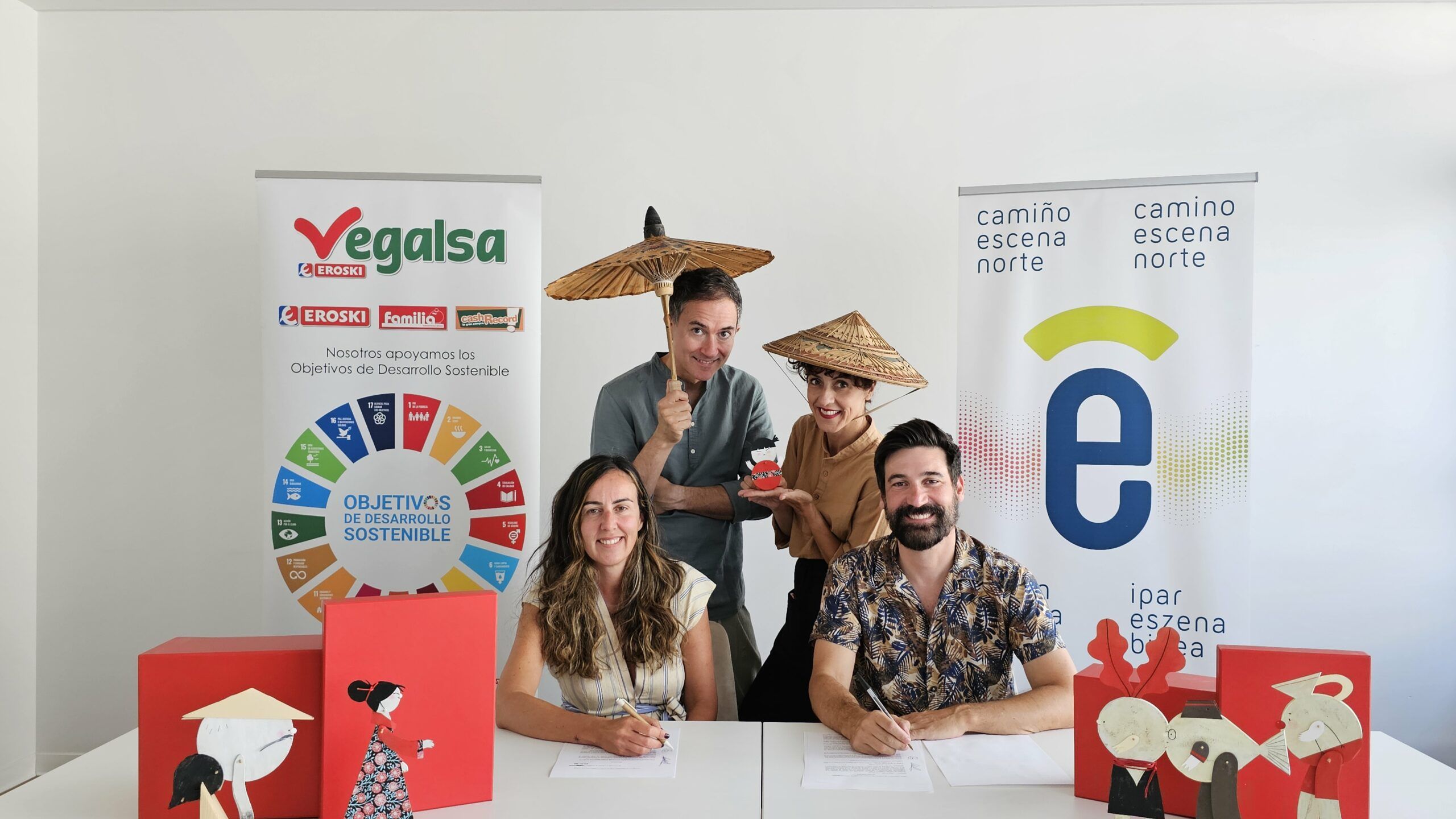 En la firma del acuerdo estuvieron presentes la directora de Sostenibilidad y Comunicación de Vegalsa-Eroski, Gabriela González; el coordinador de Camino Escena Norte, Diego V. Meizoso, gerente también de Escena Galega, la asociación promotora del proyecto en Galicia; y el representante de la Junta Directiva de Escena Galega, Gustavo del Río. El encuentro contó con parte del elenco de la compañía Pérez & Fernández, una de las tres compañías gallegas que participará este año con su montaje Nanay da China.